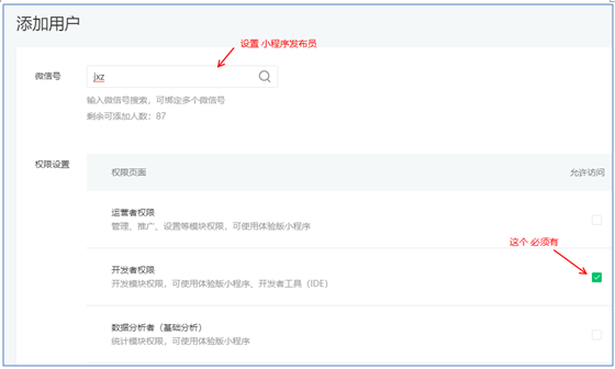 2)將我方小程序支持人員,設(shè)置為小程序開(kāi)發(fā)者,并提供企業(yè)微信的參數(shù)
