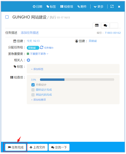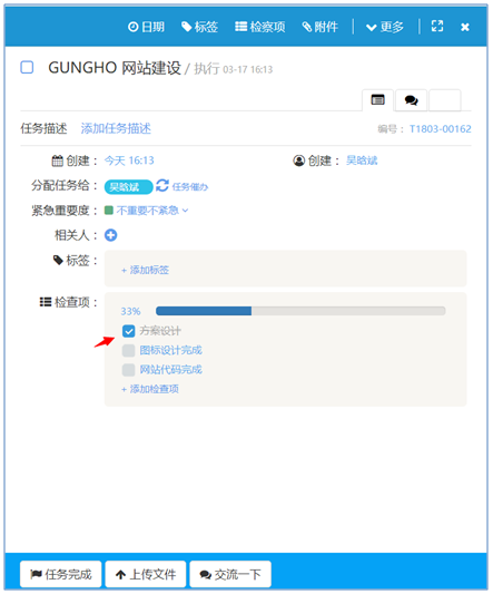 如果任務在創建時有設置過檢查點,任務執行人可以在任務顯示頁面中通過任務檢查點來設置任務進度,如下圖紅色箭頭指處所示: