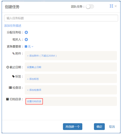 在項目中創建任務,系統彈出的創建任務彈框會比平常任務創建彈框多一個歸檔目錄設置,如下圖紅色框線區域所示。