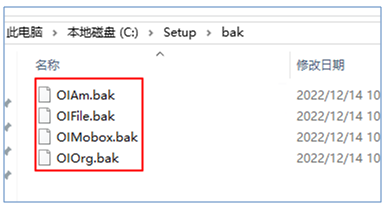 - Bak里面包括4個數(shù)據(jù)庫(OIAm、OIMobox、OIOrg、Oifile)的bak文件 (參考下圖)