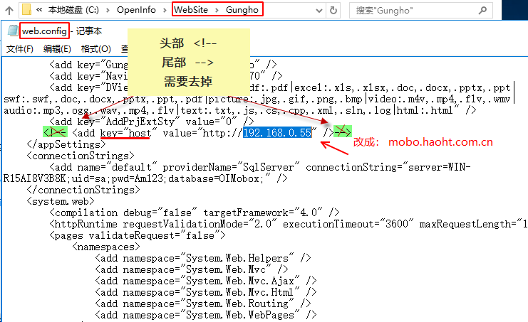 打開網站程序路徑? \OpenInfo\WebSite\Gungho\web.config? ?,具體看自己安裝路徑