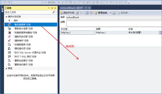3、點擊上方欄的工具箱,選擇“備份數據庫任務”,用鼠標左鍵點住并將其拖到右側空白處,然后雙擊該任務