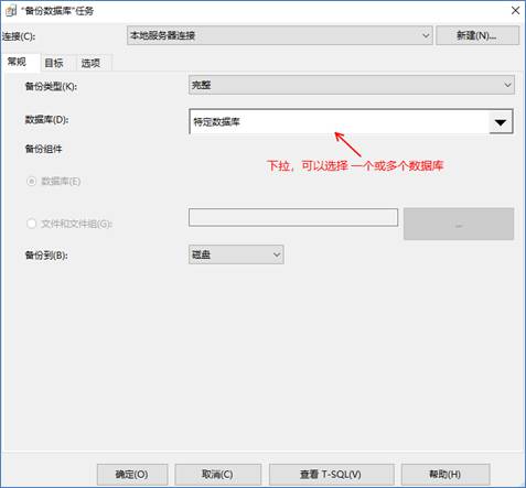 4、在彈出窗口中,先選擇“備份類型”(完整/差異/事務日志),然后選擇您要備份的具體一個或多個數據庫。如您所見,您可以選擇備份所有數據庫、系統數據庫、用戶數據庫和特定數據庫。之后再選擇一個用于存放此備份的目標路徑,點擊“確定”