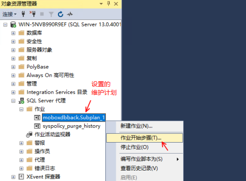 7、設置完畢之后,返回對象資源管理器,然后依次展開“SQL Server代理”>“作業”,找到剛剛創建的SQLserver定時備份數據庫任務并右鍵單擊它,選擇“作業開始步驟”以啟動此任務