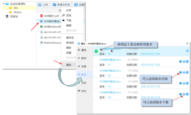 版本管理是一個非常重要的功能,在文檔中心及部門共享內,文檔柜里面同名文件多次上傳后會產生版本,可以設置哪個版本為有效版本 ,可以按需下載歷史版本